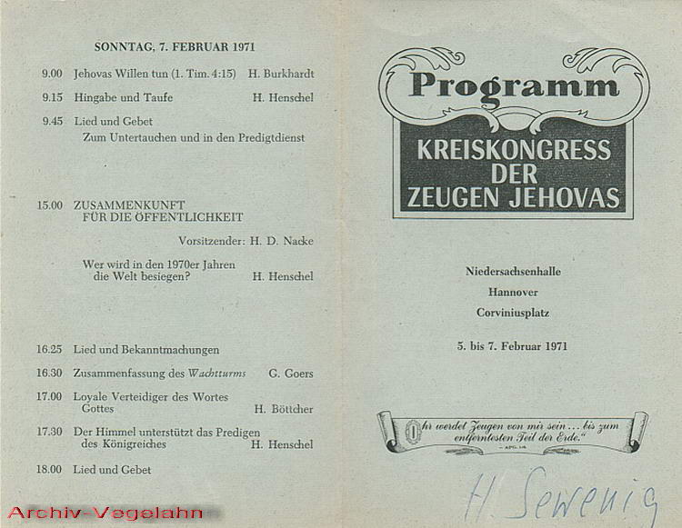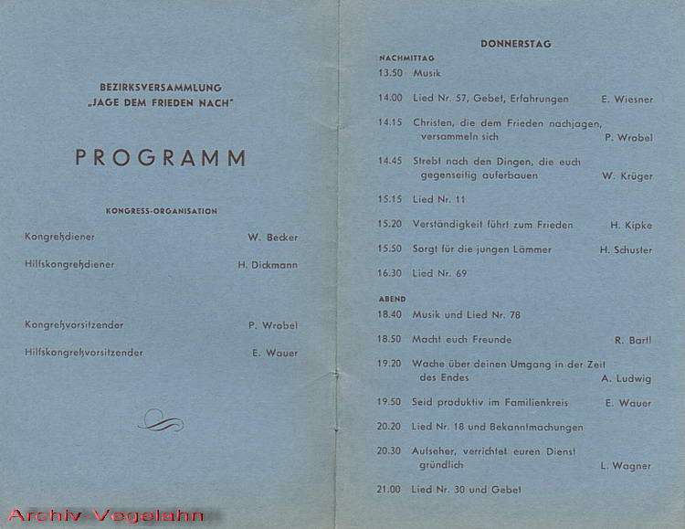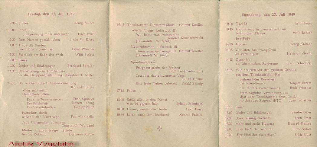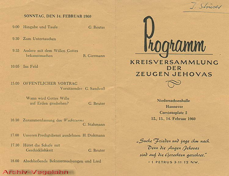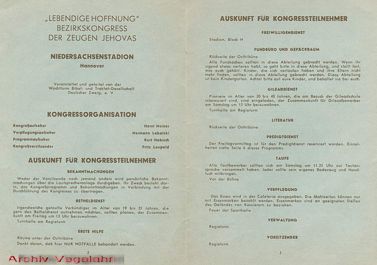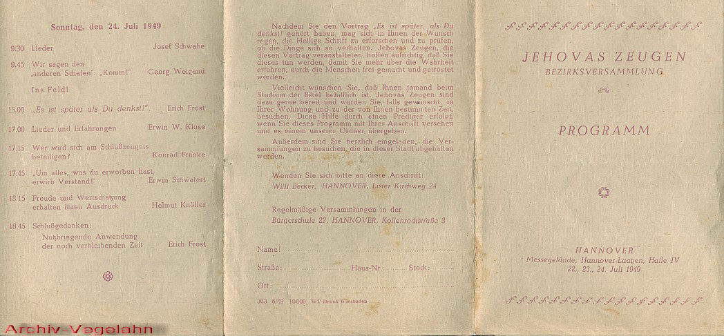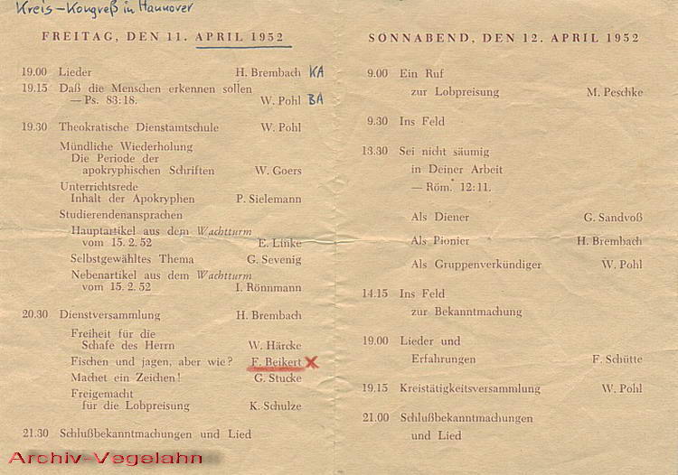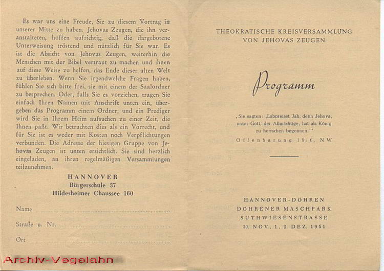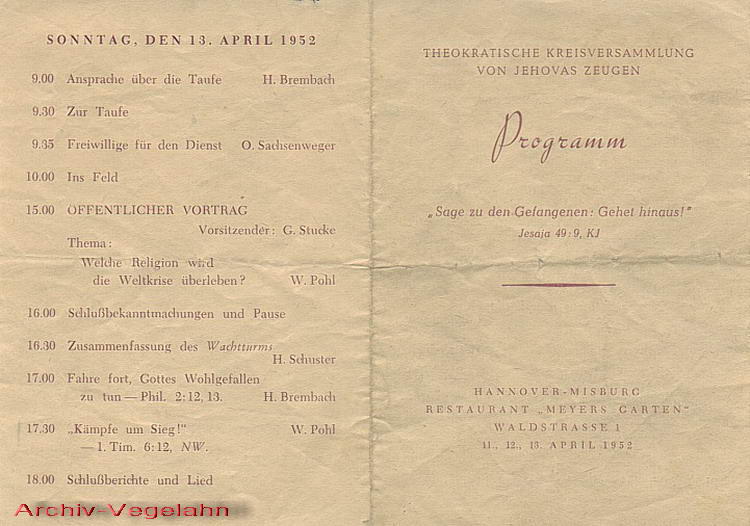 Theokratische Kreisversammlung11.04.-13.04.1951 Hannover Misburg Restaurant Meyers Garten - Waldstrasse -