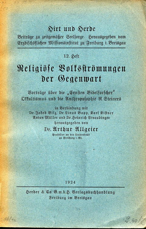 Allgeier, Arthur: Religiöse Volksströmungen der Gegenwart, Vorträge über die "Ernsten Bibelforscher" Okkultismus und die Anthroposophie R. Steiners (Hirt und Herde, Heft 12); Freiburg im Breisgau: Herder & Co. GmbH; 1924; 6, 154 S.
