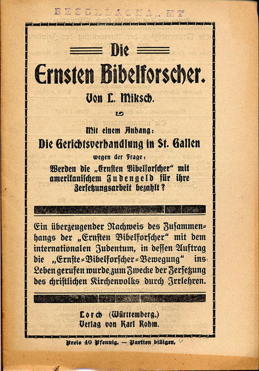 Werden die "Ernsten Bibelforscher" mit amerikanischen Judengeld für ihre