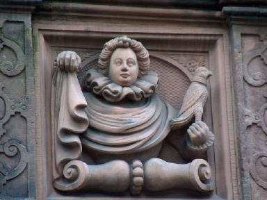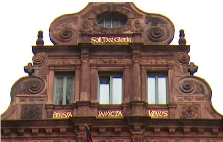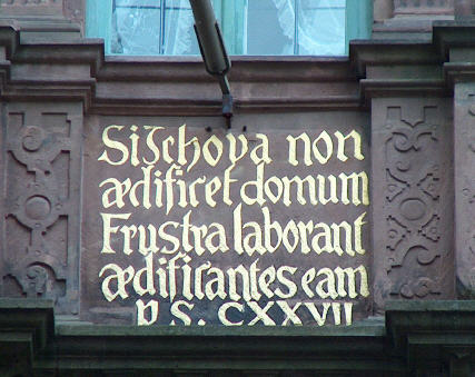„Wenn Jehova das Haus nicht baut, vergeblich arbeiten daran die Bauleute“, aus Psalm 127, Vers 1.Wie viele Umbauten in der wechselvollen Geschichte das Haus in seinem Innern verändert haben mögen, ist nicht belegt. Doch zu jeder Zeit waren sich die jeweiligen Besitzer auch bei der Gestaltung der Räume hinter der prachtvollen Fassade dieses Auftrages bewußt. Im Jahre 1681 fand das Gebäude, das alle Kriege und Brände in Heidelberg als einziges überdauerte, erstmals Erwähnung als Gasthaus.