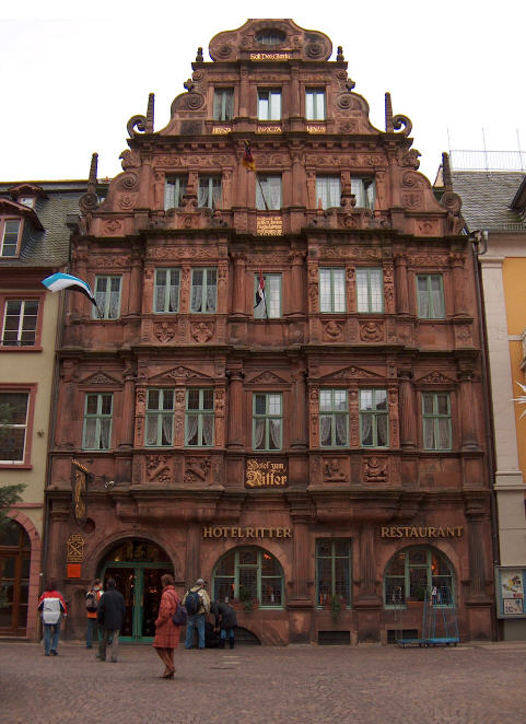 Der Ritter gegenüber der Heiliggeistkirche überlebte als eines der wenigen Häuser Heidelbergs die Zerstörung im Pfälzischen Erbfolgekrieg. Dieses Gebäude der Spätrenaissance wurde 1592 im Auftrag des aus Frankreich emigrierten Hugenotten Charles Belier errichtet. Die Rittergestalt des Sankt Georg an der Spitze verlieh dem Haus seinen Namen. Berühmt ist "der Ritter" vor allem wegen der üppig mit Ornamenten verzierten Renaissancefassade.Der Tuchhändler Carolus Belier und seine Ehefrau Francisca ließen das Giebelhaus aus gehauenem Stein, voll kannelierter Säulen und kunstvoll gemeißelter Fensterblöcke im Jahre 1592 erbauen; heute steht es unter Denkmalschutz.