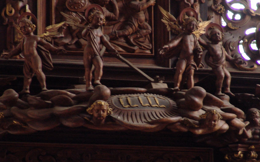 Altar: Seine Spitze bekrönt eine von Strahlenbündeln umgebene Sonne, deren Oval ein Dreieck als Trinitätssymbol und die hebräischen Buchstaben JHWH [**] aufnimmt.D - Gutenzell