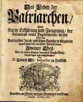 Mel, Conrad: Das Leben der Patriarchen / Oder Kutze Erklärung und Zueigung / der Geheimnuß=vollen Begegebenheiten / die sich Mit dem Patriarchen Jacob / und seiner Familie in Aegypten zugetragen / biß ans Ende seines Lebens. Zweiyter Theil / Uber die, letzten Capitel des ersten Buchs Mose: Vorgetragen und außgefertiget / Von D. Conrad Mel / Inspector zu Herßfeld; Frankfurt am Mayn / verlegts Dominicus von Sand.; 1741; Vorwort, 928 S. Anhang;