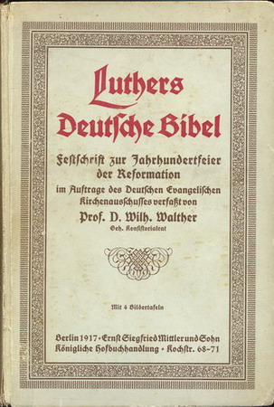 Walther, Wilhelm: Luthers Deutsche Bibel. Festschrift zur Jahrhundertfeier der Reformation im Auftrag des Deutschen Evangelischen Kirchenauschusses, Mit 4 Bildertafeln; Berlin: Ernst Siegfried Mittler und Sohn; 218 S.