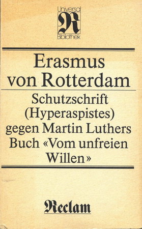 Erasmus, Desiderius: Schutzschrift (Hyperaspistes) gegen Martin Luthers Buch "Vom unfreien Willen" / Erasmus von Rotterdam. [Übers. von Oskar Johannes Mehl. Hrsg. u. mit e. Nachw. von Siegfried Wollgast]; Leipzig: Reclam, 1986; 269 S.;