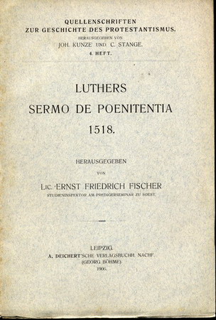 Fischer, Ernst Friedrich: Luthers Sermo de Poenitentia (Quellenschriften zur Geschichte des Protestantismus, 4.Heft); Leipzig: A.Deichert´sche Verlagsbuchh. Nachf.; 1906; 37 S.;