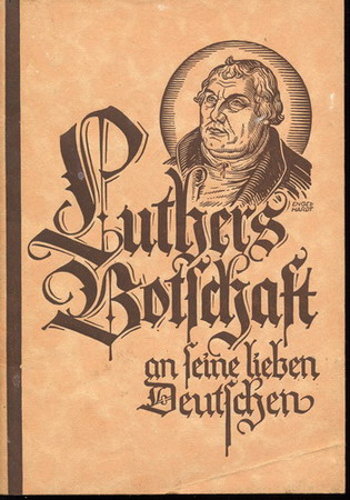 Bürck, Max: Luthers Botschaft an seine lieben Deutschen (Hrsg.: Glaubensbewegung "Deutsche Christen" Gau Baden); Freiburg i. Br.: "Kirche und volk", Verlagsdruckerei Bär & Bartosch; 5.-6.Tsd. 1933; 32 S.;
