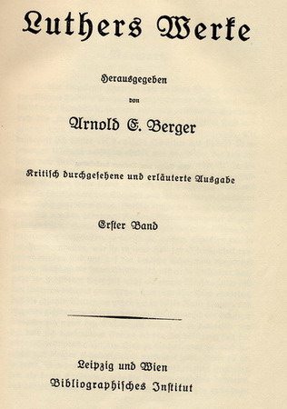 Berger, Arnold E.: Luthers Werke. Kritisch durchgesehen und erläuterte Ausgabe, 1. Band: Schriften 1518-2, 2. Band: Schriften 1522-26; 3. Band: Schriften 1528-39 Lieder; Leipzig Wien: Bibliographisches Institut; o.J; 360, 383, 408 S.