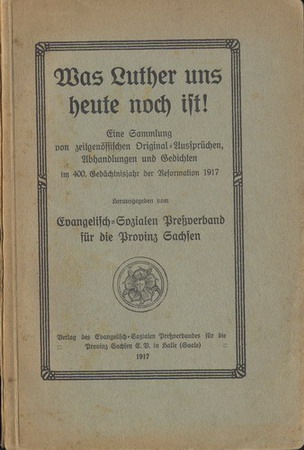Evangelisch=Sozialer Preßverband für die Provinz Sachsen (Swierczewski): Was Luther uns heute noch ist! Eine Samml. v. zeitgenöss. Orig.-Aussprüchen, Abh. u. Gedichten im 400. Gedächtnisjahr d. Reformation 1917; 184 S.