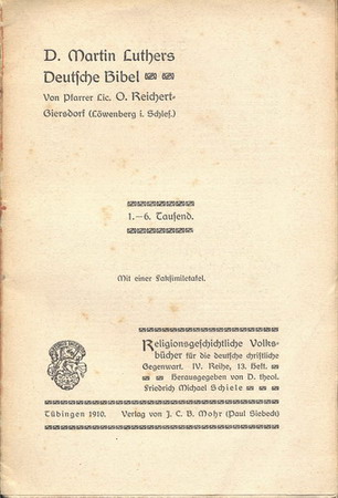 Reichert, O.: D. Martin Luthers Deutsche Bibel. (religionsgeschichtliche Volksbücher für die deutsche christliche Gegenwart. IV. Reihe, 13. Heft (Hrsg.: Friedrich Michael Schiele); Tübingen: J.C.B. Mohr (Paul Siebeck); 1910; 44 S.