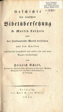 Schott, Heinrich: Geschichte der teutschen Bibelübersetzung D. Martin Luthers und der fortdauernde Werth derselben aus den Quellen ausführlich dargestellt und wider alte und neue Gegner vertheidiget; Leipzig: ; Karl Franz Köhler; 1835; XII, 204 S.;