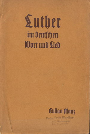 Manz, Gustav: Martin Luther im deutschen Wort und Lied. Eine Festgabe zum 400jährigen Gedenktag der Reformation; 1917; Berlin: Verlag des Evangelischen Bundes; 198 S.