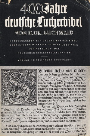 Buchwald, Georg: 400 Jahre deutsche Lutherbibel. Herausgegeben zum Gedenkjahr der Bibelübersetzung D. Martin Luthers (1534-1934) vom Ausschuss der Deutschen Bibelgesellschaften; Stuttgart: J.F. Steinkopf; 1934; 32 S.