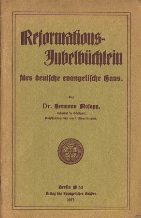 Mosapp, Hermann: Reformations-Jubelbüchlein fürs deutsche evangelische Haus; Berlin: Verlag des Evangelischen Bundes; 1.-100 Tsd. 1917; 48 S.