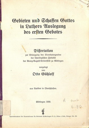Gühloff, Otto: Gebieten und Schaffen Gottes in Luthers Auslegung des ersten Gebotes. Dissertation. Göttingen: 1939; 101 S.