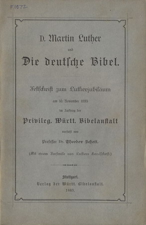 Schott, Theodor: D. Martin Luther und die deutsche Bibel : Festschrift zum Lutherjubiläum am 10. Nov. 1883 im Auftr. d. Privileg. Württ. Bibelanst.. - (Mit e. Facs. von Luthers Handschrift) / verf. von Theodor Schott ; Stuttgart : Verl. d. Württ. Bibelanst., 1883. - 48 S. : Ill.;