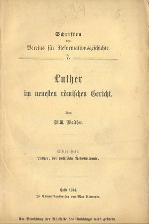 Walther, Wilhelm: Luther im neuesten römischen Gericht. (Heft 1: Luther, der politische Revolutionär, Schriften des Vereins für Reformationsgeschichte 7); Halle: Commissionsverlag von Max Niemeyer; 1884;