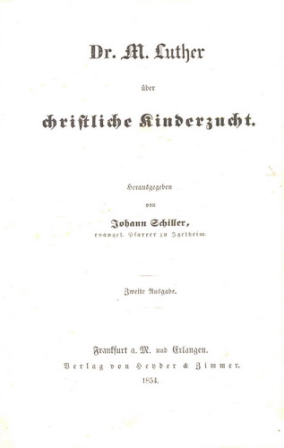 Schiller, Johann: Dr.M. Luther über christliche Kinderzucht; Frankfurt a.M. und Erlangen: Heyder & Zimmer; 1854; 122 S.