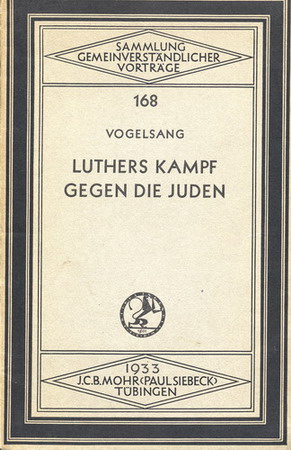 Vogelsang, Erich: Luthers Kampf gegen die Juden (Sammlung Gemeindeverständlicher Vorträge, 168);b Tübingen: J.C.B. Mohr (Paul Siebeck); 1933; 35 S.