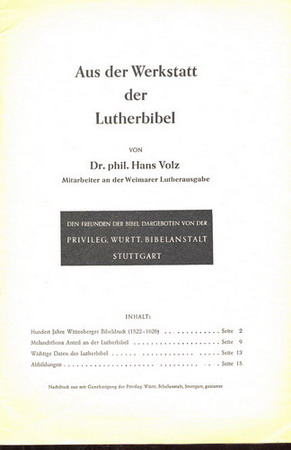 Volz, Hans: Aus der Werkstatt der Lutherbibel; Stuttgart: Privileg. Württ. Bibelanstalt; o.J. 24 S.