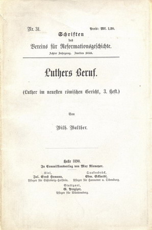 Walther, Wilhelm: Luthers Beruf (Luther im neuesten römischen Gericht, 3.Heft , Schriften des Vereins für Reformationsgeschichte 31); Halle: Commissionsverlag von Max Niemeyer; 1890; 157 S.;