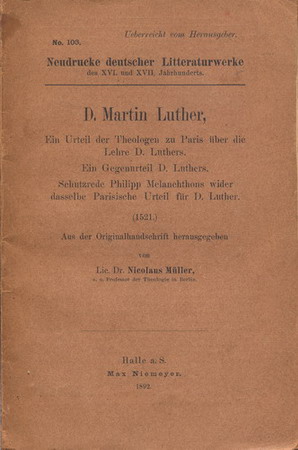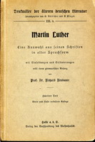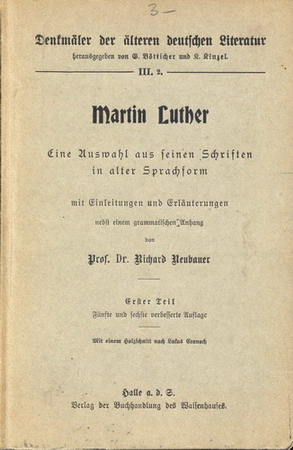 Neubauer, Richard: Martin Luther. Eine Auswahl aus seinen Schriften in alter Sprachform, Erster Teil (Denkmäler der älteren deutschen Literatur III. 2 ; Halle a.d.S.: Verlag der Buchhandlung des Waisenhauses; 1913; 286 S.