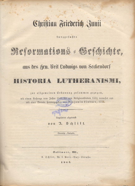 Schlitt, A.: Junii, Christian Friedrich: kurzgefaßte Reformations=Geschichte, aus des Hrn. Veit Ludwigs von Seckendorf Historia Lutheranismi, zur allgemeinen Erbauung zusammen gezogen, mit einem Anhang vom Jahre 1546 bis zum Religionsfrieden 1555 vermehrt und mit einer Vorrede herausgegeben von Benjamin Lindner, 1755. Balitimore, Md., A.Schlitt, No.6 Nord=Gay=Straße; 1865; 418 S.;
