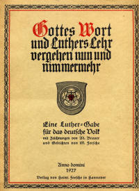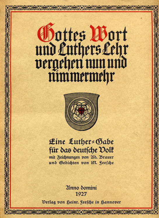 Brauer, Ad. - Feesche, M.: Gottes Wort und Luthers Lehr vergehen nun und nimmermehr. Eine Luther=gabe für das deutsche Volk mit Zeichnungen von Ad. Brauer und Gedichten von M. Feesche; 3.Aufl. 1927; Hannover: Verag von Heinr. Feesche; 32 S.