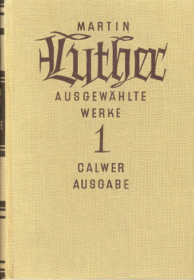 Calwer Ausgabe: Martin Luther - Ausgewählte Werke, Band 1-6; Stuttgart: Calwer Vereinsbuchhandlung; 1.-6.Aufl. 1930-1940; Bd.1 (1930): XVI, 396 S., Bd.2 (1931): 413 S., Bd.5 (1930): 461 S., Bd.4 (1933): XVI, 413 S., Bd.5 (1932): 429 S., Bd.6 (1940): 510 S.,