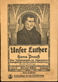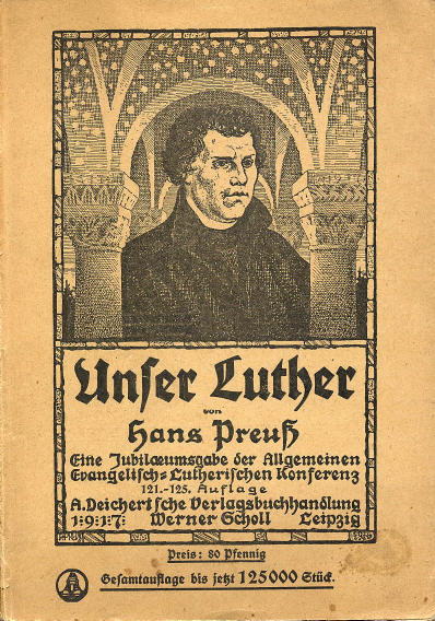Preuß, Hans: Unser Luther, eine Jubiläumsausgabe der Allgemeinen Evangelisch=Lutherischen Konferenz; 121.-125.Auflage 1917; Leipzig: A.Deichertsche Verlagsbuchhandlung Werner Scholl; 1917; 109 S.;