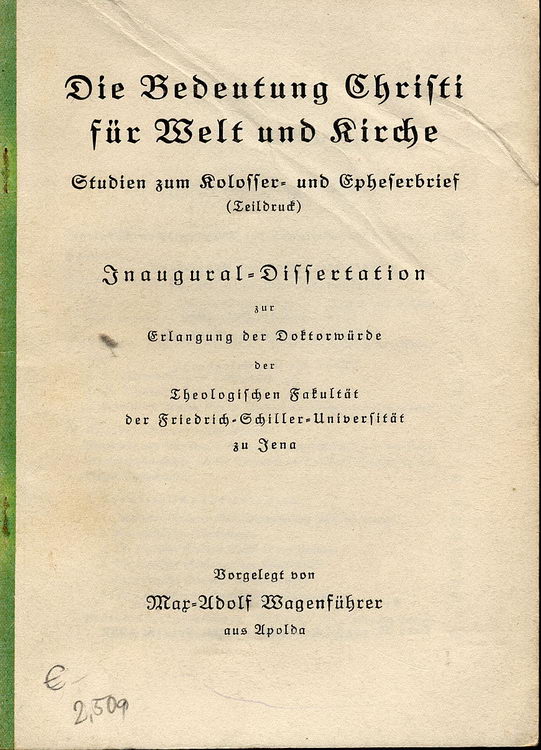 Wagenführer, Max-Adolf: Die Bedeutung Christi für Welt und Kirche, Studium zum Kolosser= und Epheserbrief (Teikldruck), Inaugural-Dissertation ... Friedrich=Scxhiller=Universität zu Jena; 1941; 39 S.