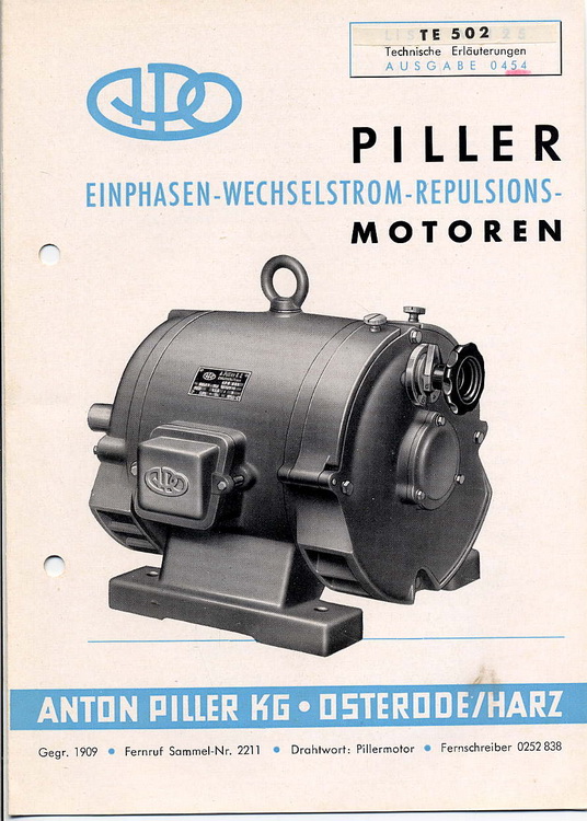 Piller Enphasen-Wechselstrom-Repulsions-Motoren Liste TE502 Ausgabe 0454; 6 S.