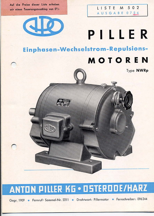 Piller Enphasen-Wechselstrom-Repulsions-Motoren Liste M502 Ausgabe 0756; 6 S.