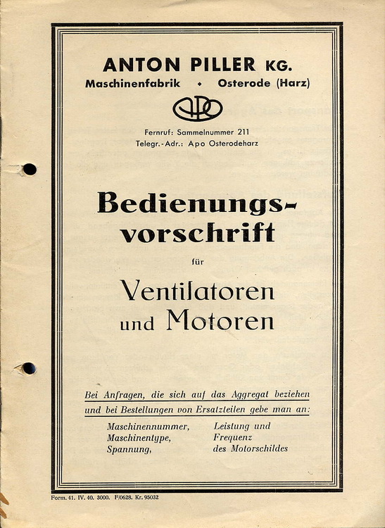 - Anton Piller KG; Bedienungsvorschrift für Ventilatoren und Motoren; Form, 41. IV.40. 3000. F/0628 Kr.95032
