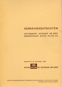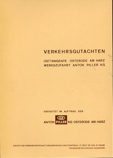 - Piller: Verkehrsgutachten - Osttangente Osterode am Harz Werkzufahrt Anton Piller KG erstattet im Auftrag der Anton Piller KG Osterode am harz; Institut für Verkehrswirtschaft und Strassenwesen und Städtebau O. Prof. Dr.-Ing. W. Grabe, Technische Hochschule Hannover; 1967; 12 S. 7 Abb.