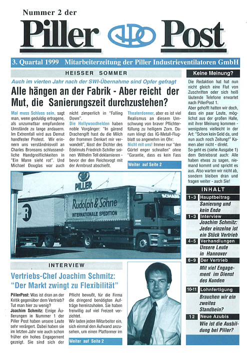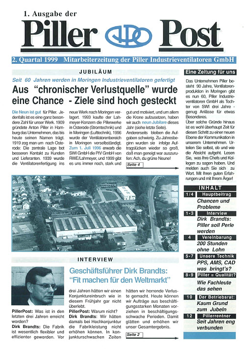 Piller Post - Mitarbeiterzeitung der Piller Industrieventilatoren GmbH; 1. Ausgabe 2.Quartal 1999; 12 S.