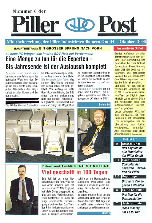 Piller Post - Mitarbeiterzeitung der Piller Industrieventilatoren GmbH; Nummer 6.; Oktober 2000; 8 S.