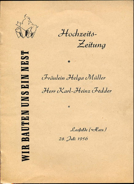 - Fedder: Hochzeitszeitung - Fräulein Helga Müller - Herr Karl-Heinz Fedder - Lasfelde (Harz) 28.Juli 1956; Lasfelde-Osterode: Buchdruckerei Hans Drake; 1956; 8 S