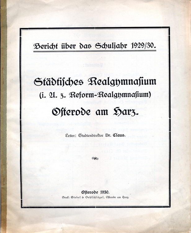 - Claus, Dr.: Städtisches Realgymnasium (i.A.z. Reform-Realgymnasium) Osterode am Harz (Bericht über das Schuljahr 1929/30); Osterode: Giebel & Oehlschlägel; 1930; 27 S.