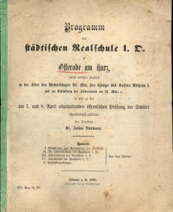 - Programm der städtischen Realschule 1.O. zu Osterode am Harz, ... Dr. Julius Nauman [Progr.Nr.263]; Osterode: F. Einschlägel; 1876; 50 S.