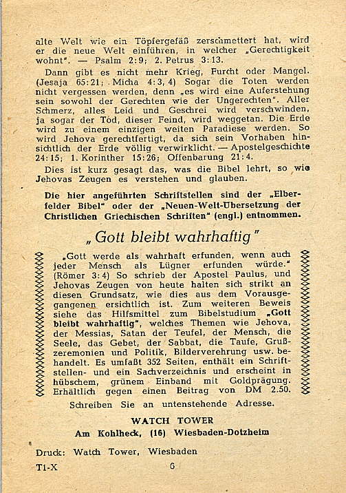 Rückseite: Angebot: „Gott bleib wahrhaftig” - DM 2,50 WATCH TOWER