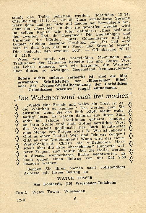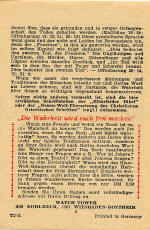 Rückseite: Angebot: „Die Wahrheit wird euch frei machen” - DM 2,50 WATCH TOWER