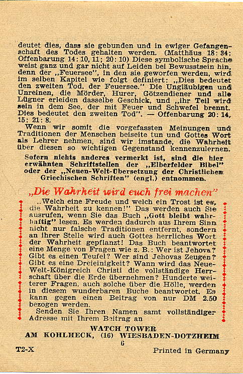 Rückseite: Angebot: „Die Wahrheit wird euch frei machen” - DM 2.- Wachtturm (16) WIESBADEN-DOTZHEIM Am Kohlheck T2-X Printed in Germany Druck: Wachturm, Wiesbaden